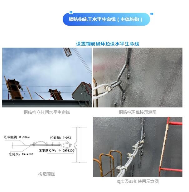 在相鄰鋼結(jié)構(gòu)立柱上焊接鋼筋拉環(huán)作為末端掛點(diǎn),通過(guò)卸扣連接鋼絲繩形成水平生命線。