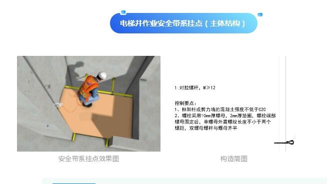 將對(duì)拉螺栓固定在電梯井墻柱上,端部焊接的圓環(huán)作為安全帶系掛點(diǎn),或通過(guò)圓環(huán)設(shè)置安全繩形成豎向生命線。