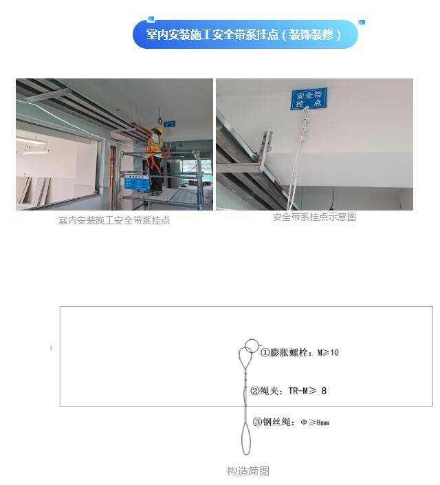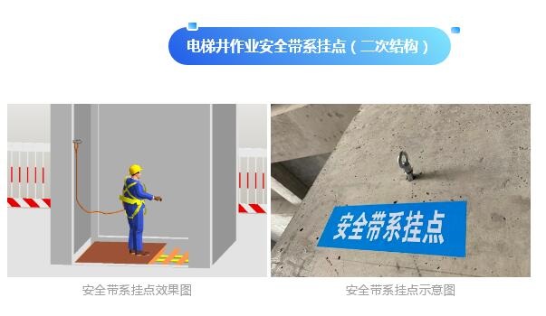 在電梯井上部墻面預(yù)埋圓鋼吊環(huán),懸掛鋼絲繩形成垂直生命線。