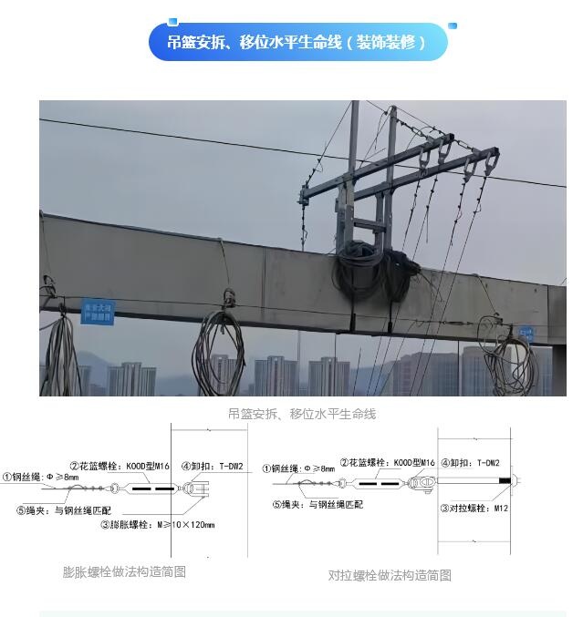 在對(duì)拉螺栓端部設(shè)置圓環(huán),通過(guò)預(yù)留螺栓孔穿進(jìn)墻內(nèi),在兩個(gè)圓環(huán)之間設(shè)置鋼絲繩形成水平生命線。