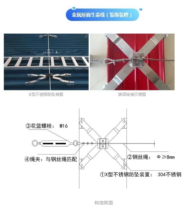 X型不銹鋼防墜裝置通過(guò)鋁合金(詞條“鋁合金”由行業(yè)大百科提供)夾具固定在金屬面板上,通過(guò)花籃螺栓、繩夾、基座拉設(shè)水平生命線。