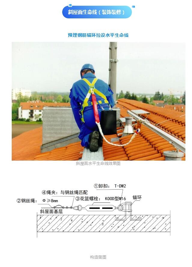 在斜屋面頂部安裝膨脹螺栓,將安全繩固定在螺栓端部圓環(huán)處,或者將安全繩固定在斜屋面頂部結(jié)構(gòu)上,安全繩沿斜屋面豎向布置,工人安全帶通過(guò)自鎖器系掛在安全繩上。