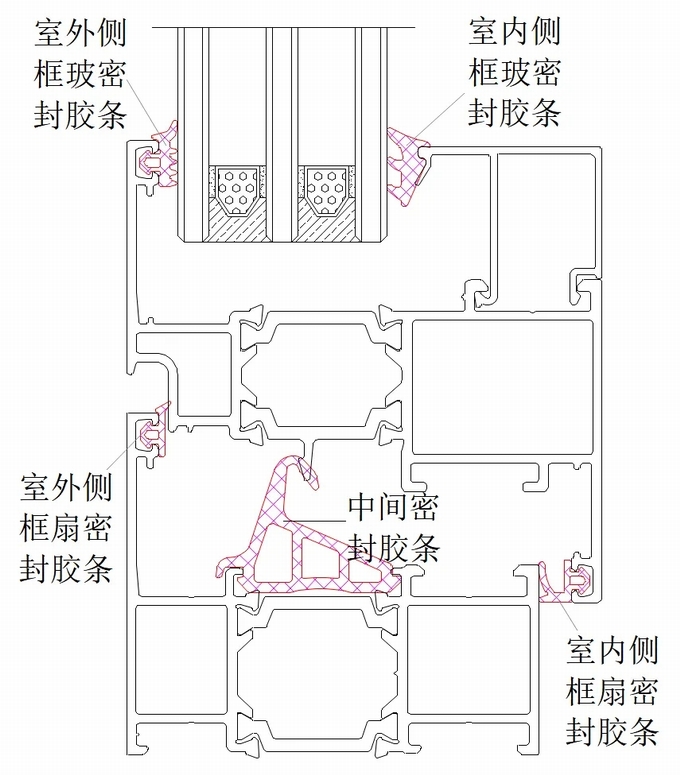 框扇中間密封膠條也常常稱為主密封膠條或等壓密封膠條,在型材中起到阻斷空氣對流和熱輻射功能,既要滿足密封要求,又要滿足門窗啟閉力要求。