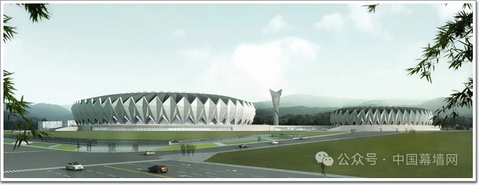 南平體育中心的外觀設計結合了“武夷茶花”的構思理念,用民間折紙的設計手法構造兩座“武夷茶花”造型的建筑,立面中每榀如同一只“千紙鶴”的翅膀,幾十只翅膀串連起來,猶如一朵盛開的白色“武夷茶花”。