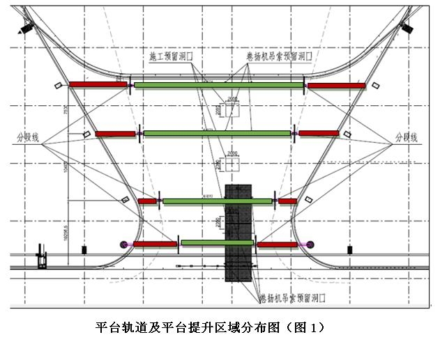 整個系統設置4條平臺軌道,3臺移動工作平臺,8個卷揚機吊繩點,每臺工作平臺設4個提升點。平臺提升位設置于中間位置(見下圖)。