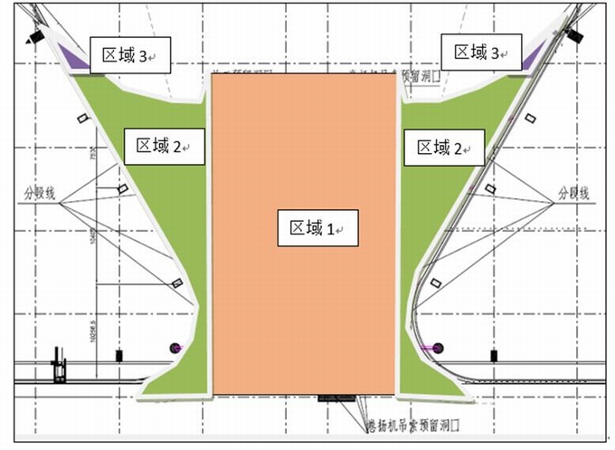 本系統分為三個工作面:(1)中間大面區域(區域1),可以通過平臺標準布置來完成施工;(2)邊部區域(區域2),可以通過平臺的斜向布置來完成作業;(3)角部部區域(區域3)通過吊頂擦窗機配合施工來完成。安裝次序為先中間后兩邊。見下圖。