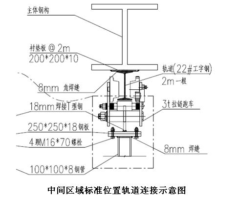 平臺與軌道的鏈接通過3T的拉鏈軌道跑車進行鏈接,每個鏈接點采用2個軌道跑車進行鏈接,其中一個跑車通過3T手拉葫蘆與平臺進行鏈接,平臺調整平整到位后,再用第二個軌道跑車通過100*100*8的方管與平臺可靠鏈接,防止平臺晃動。