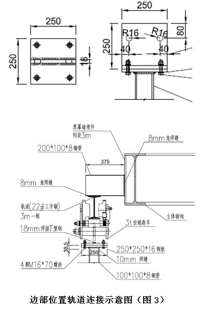 邊部特殊位置平臺導軌為空中焊接安裝部分(下圖1紅色部分),此部分工作面使用下懸掛腳手架平臺安裝(下圖2)。軌道由3m長22#工字鋼組成,軌道焊接在主體鋼構上,角焊縫為8mm(圖3)。待主體桁架提升后利用反吊腳手架作為工作平臺焊接安裝邊部軌道。